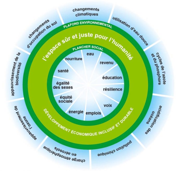 L’objectif du donut est simple : que personne ne soit privé des ressources de base mais sans mettre en danger les systèmes qui garantissent le délicat équilibre de la vie, quand on se fixe un tel objectif, le progrès n’a plus la même trajectoire, ce n’est plus une croissance infinie, c’est trouver l’équilibre entre le plancher social et le plafond écologique à voir sur Arte